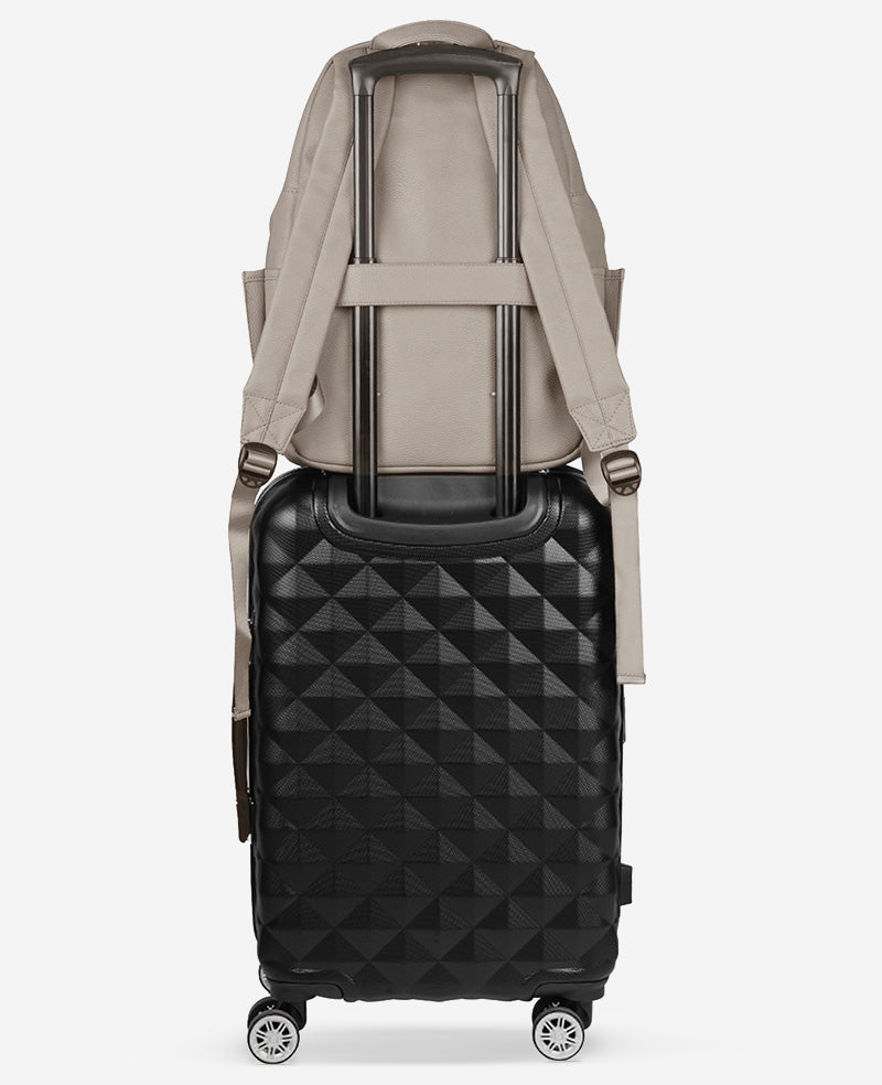 • Trolley Strap that allows luggage to sit on handle of upright luggage when traveling and convert to pocket when not in use