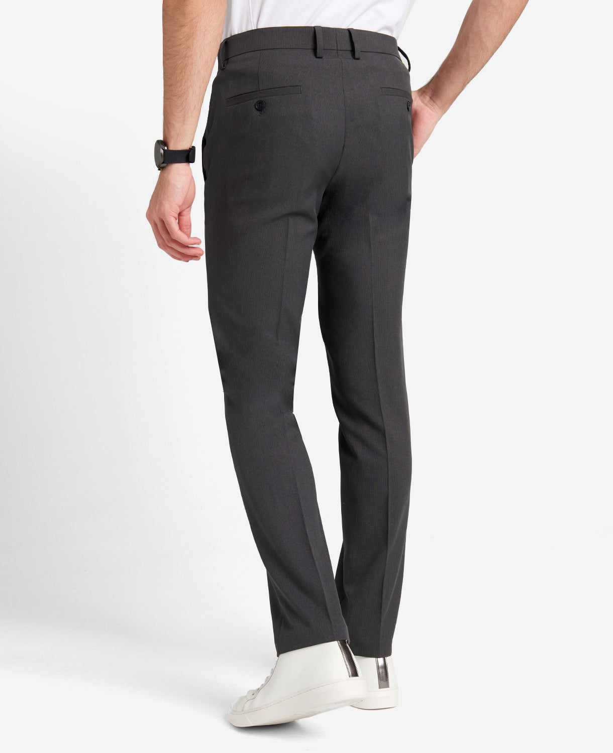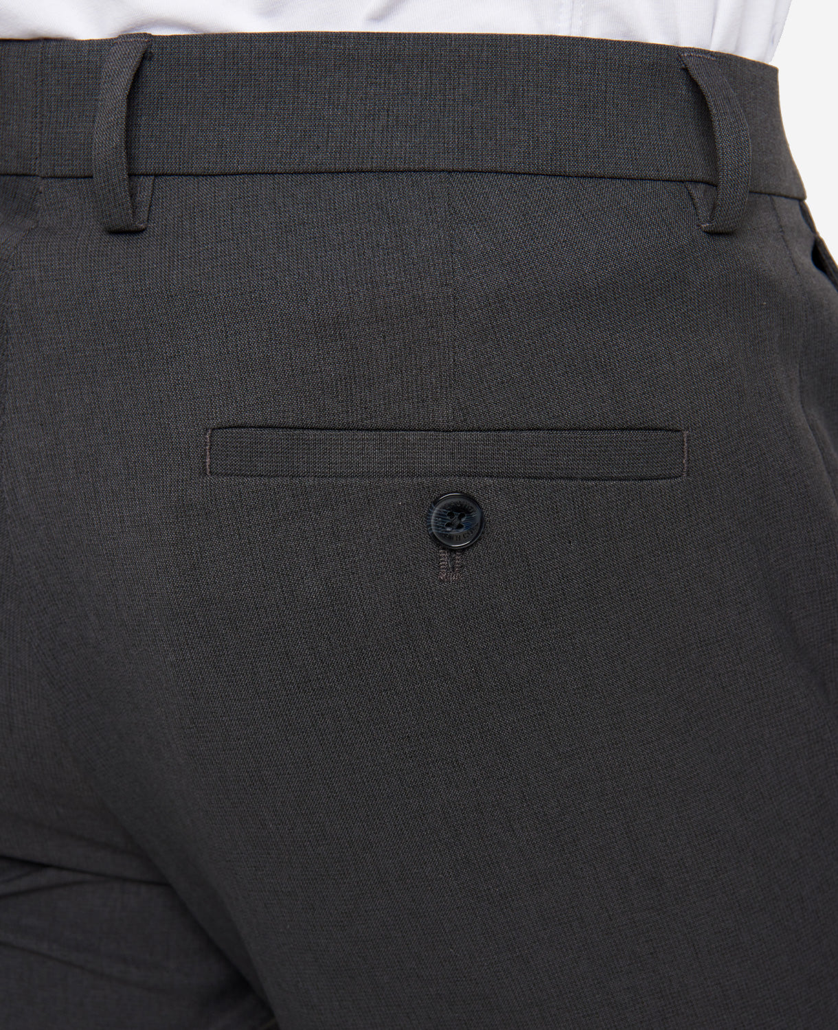 - Single-welt button-through back pockets and a blind hem