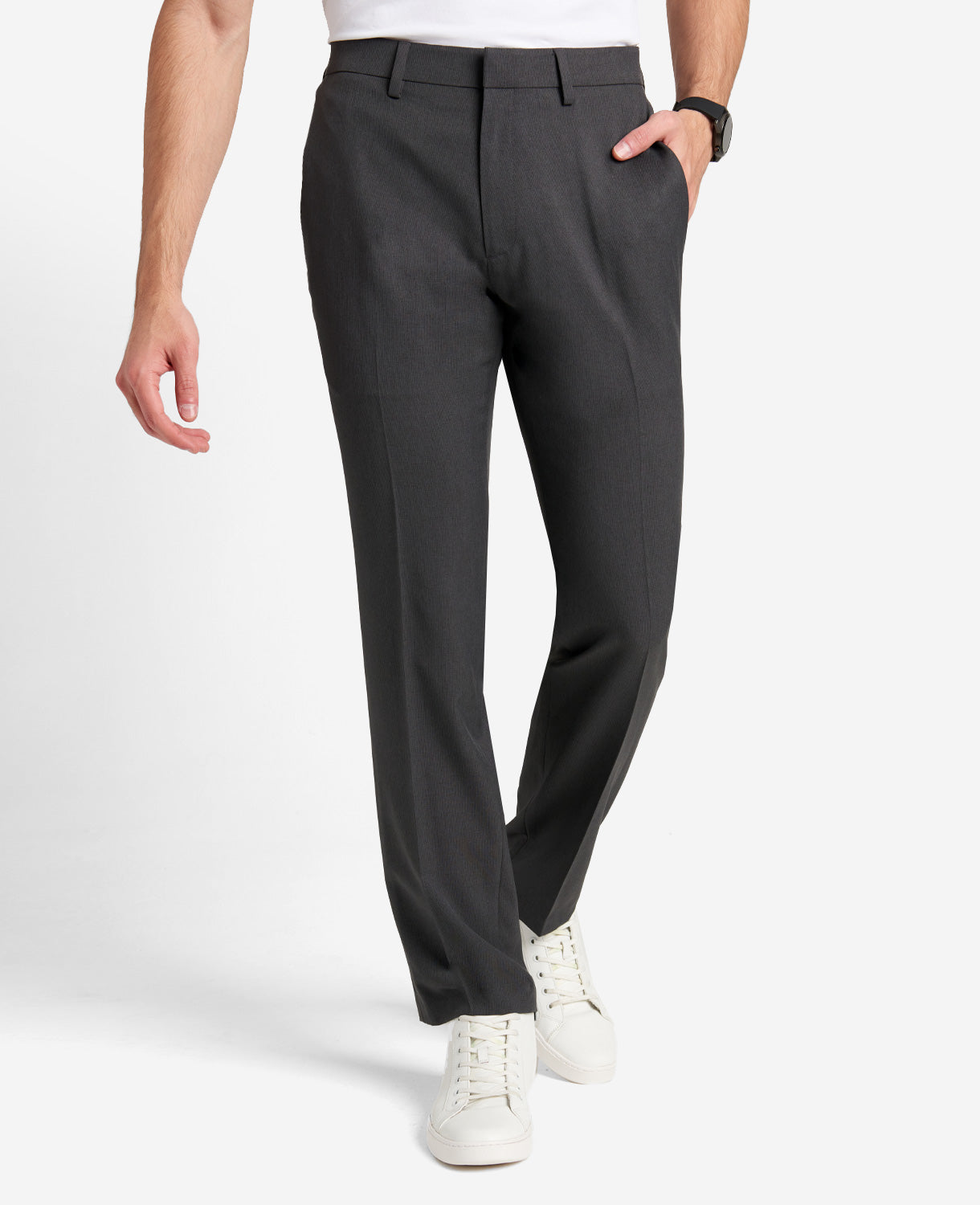 - Hook and bar closure for a seamless look in a flat front modern-fit silhouette