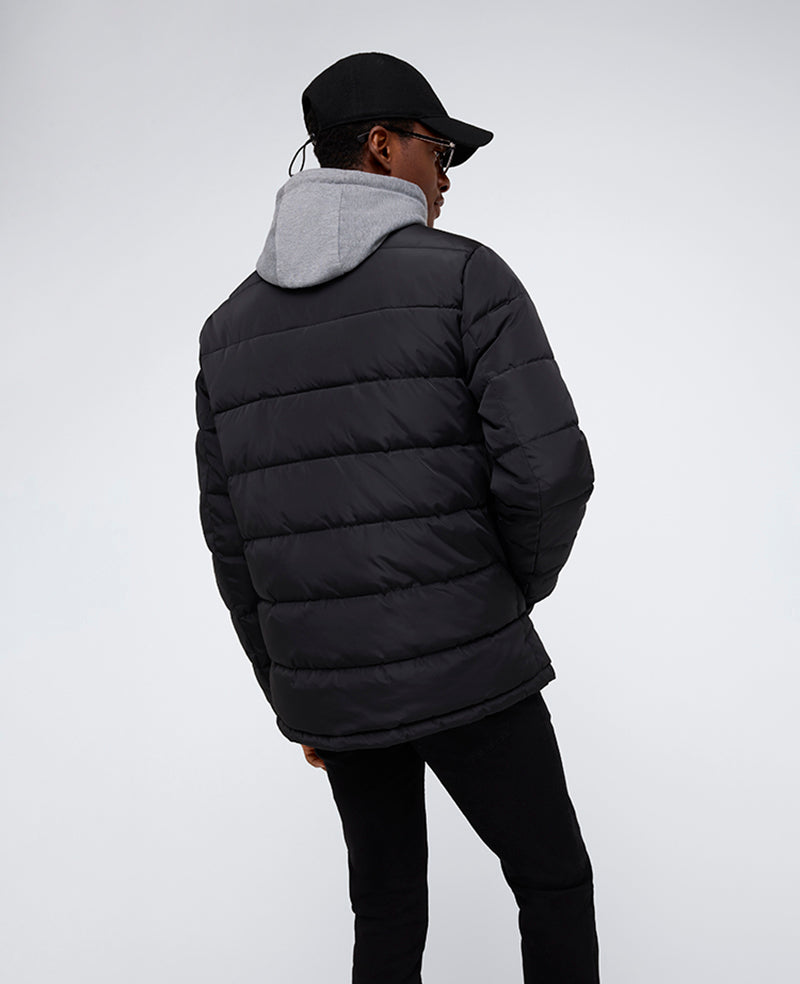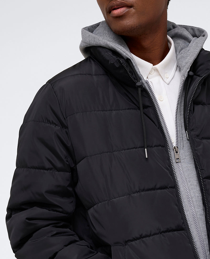 • Shell: 100% polyester; Lining: 100% polyester; Fill: 100% polyester; Hood bib: 100% polyester