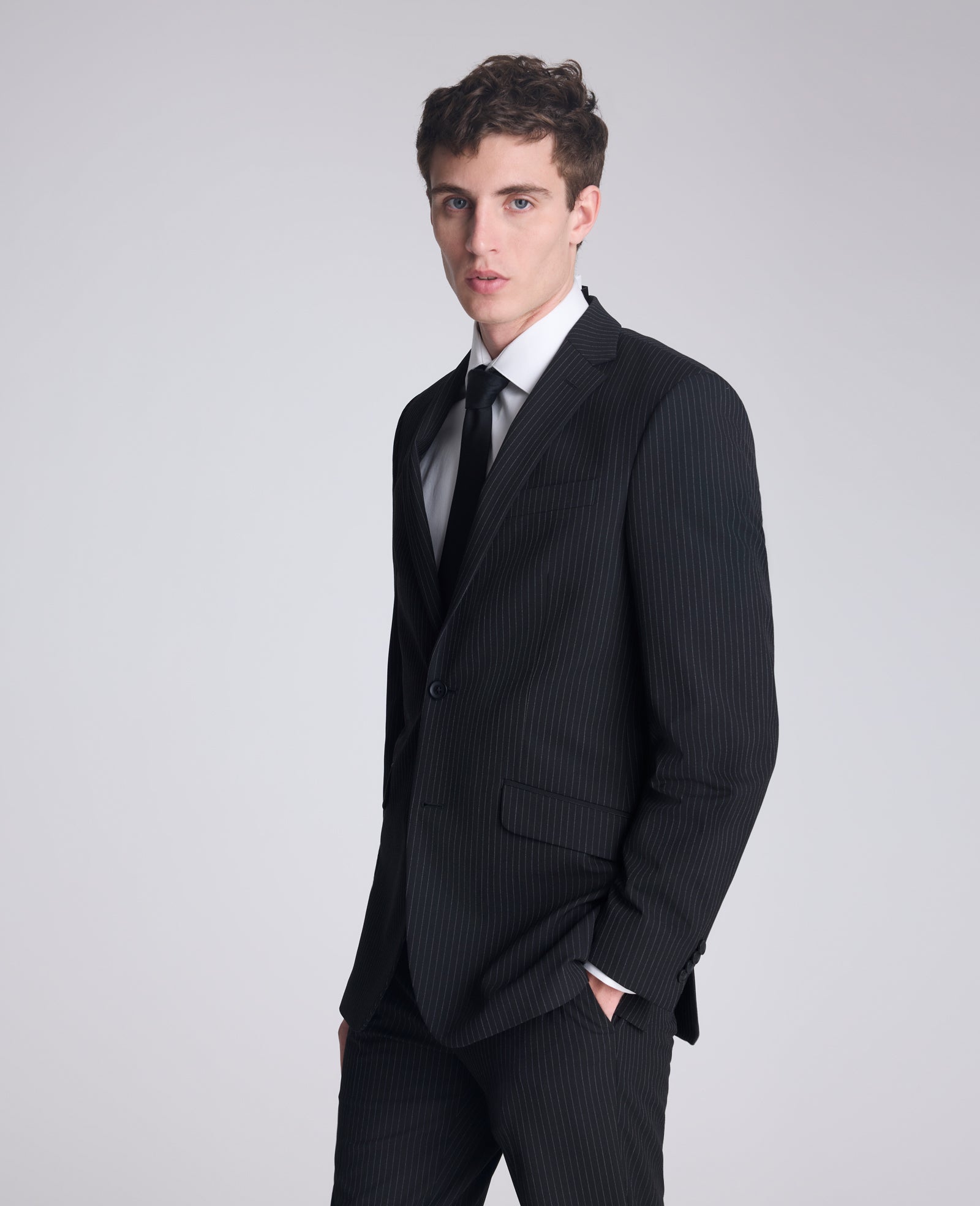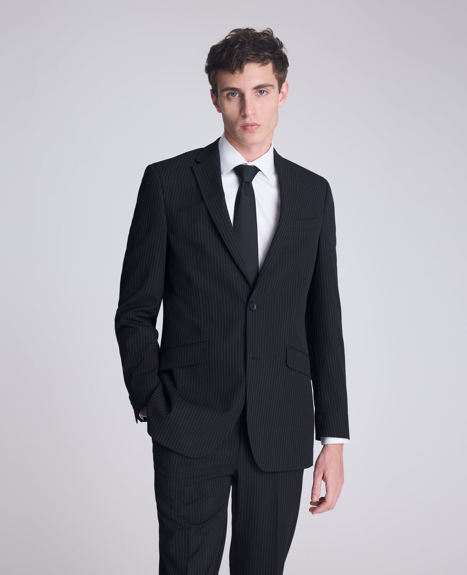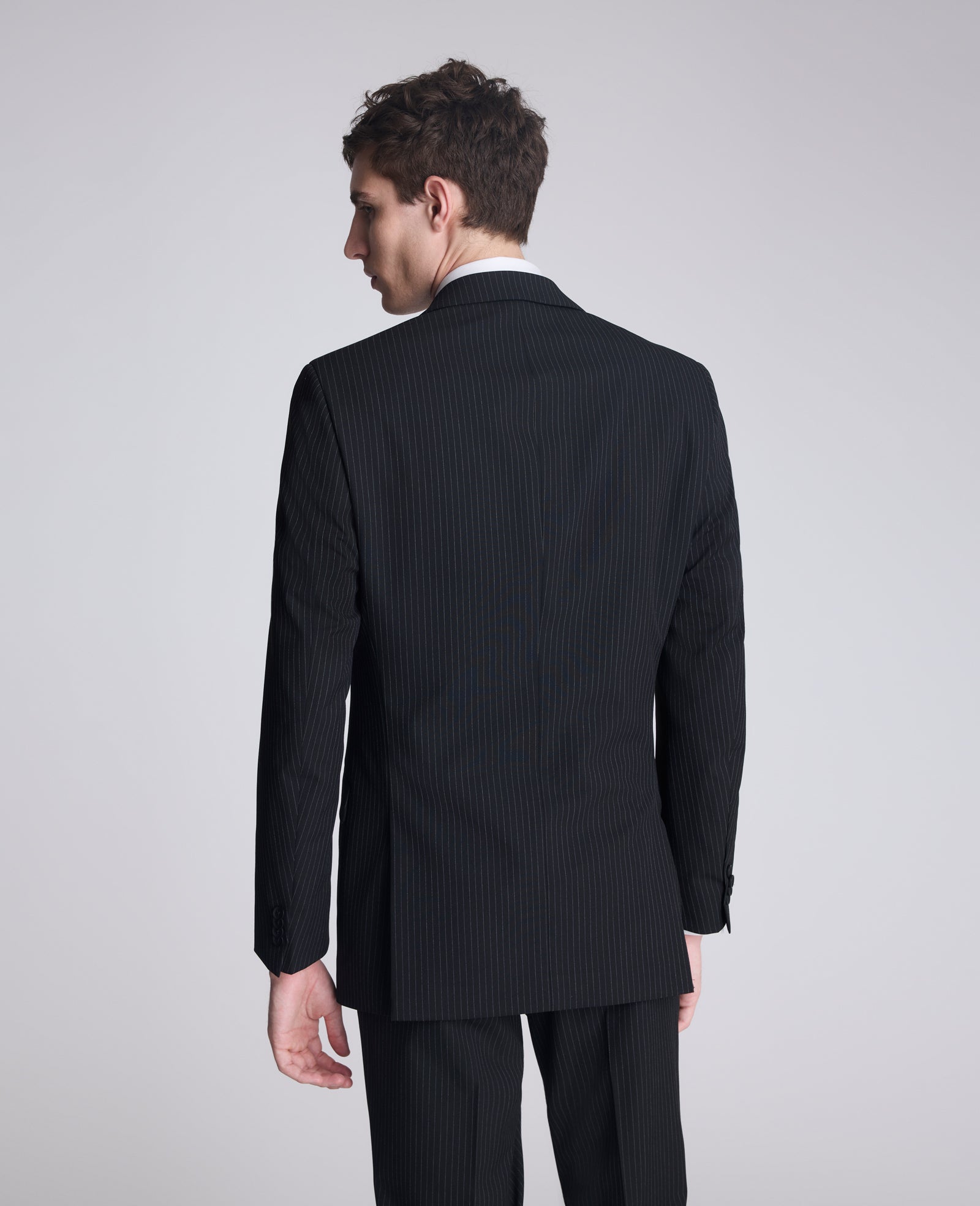 - Jacket: notched lapel, higher armhole placement with stretch, single-breasted with matching shell-look buttons, double vented, side flap pockets
