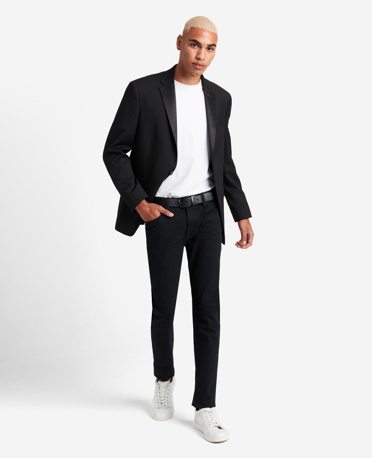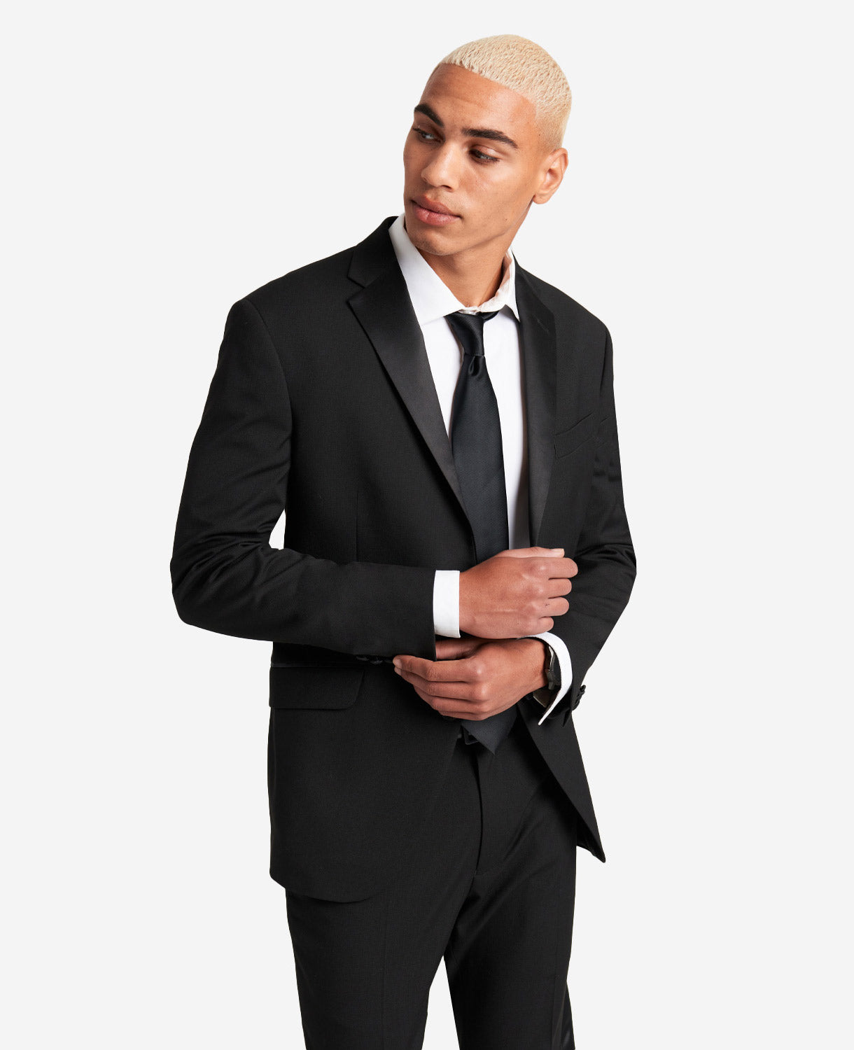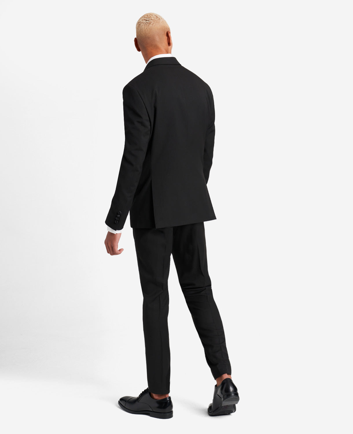 - Jacket: notched satin lapel, higher armhole placement with stretch, single-breasted with matching shell-look buttons, double vented, side flap pockets, welt pockets at breast and interior