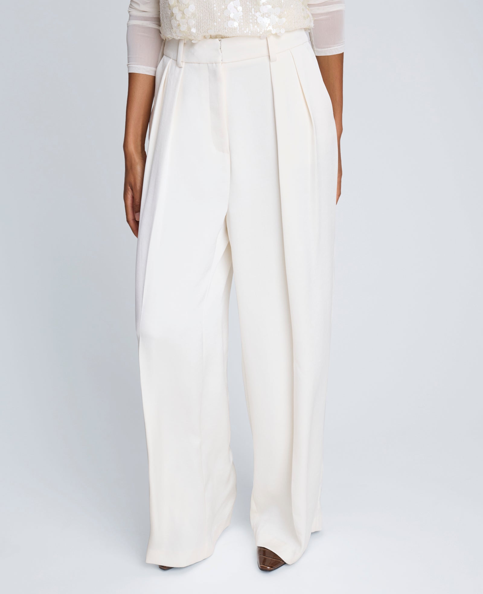 Satin High Rise Fly Front Double Pleated Wide Leg Pant