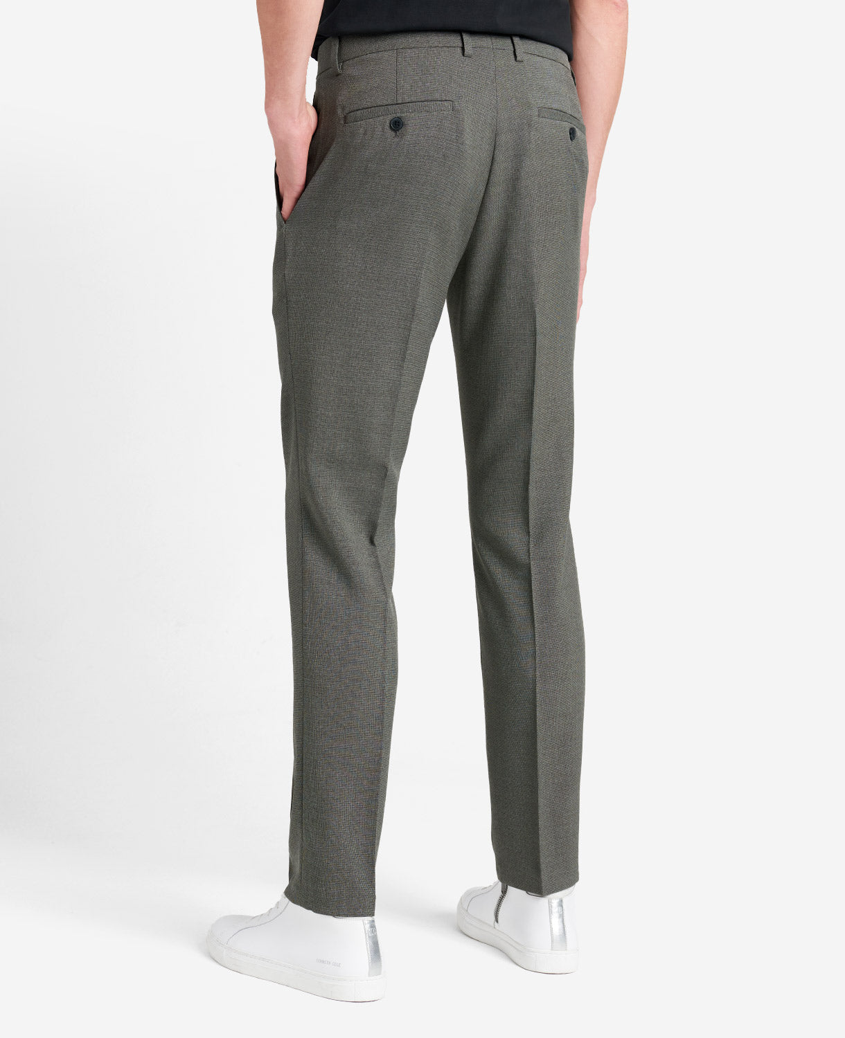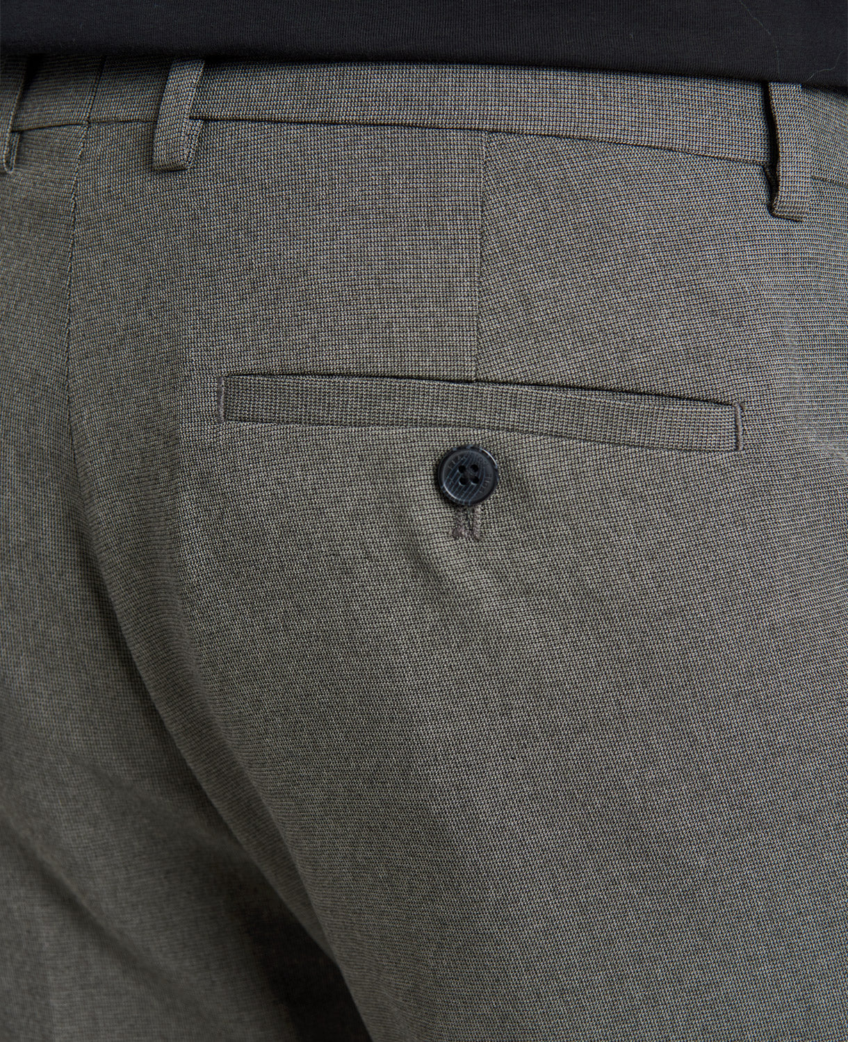 - Hook and bar closure for a seamless look in a flat front modern-fit silhouette