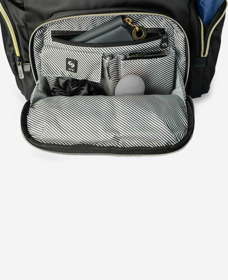 - Several pockets boast Techni-Cole RFID protected zip down organizer pocket — helping to prevent radio waves from being transmitted from passports and some credit/debit cards
